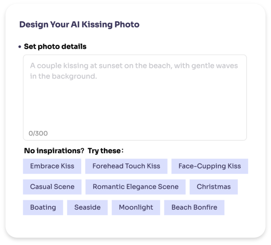 시작하려면 원하는 키스 사진을 몇 문장으로 설명하세요. 자세히 설명할수록 만족스러운 사진을 얻을 수 있다는 점을 명심하세요.